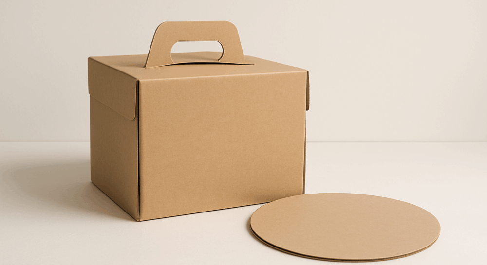 Классические разборные коробки делают из плотного картона 250–350 г/м² — они лёгкие, удобные и подходят для большинства одноярусных тортов.